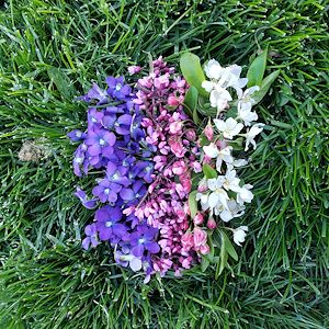 she arranged the flowers in a circular pattern in the freshly cut grass in her yard.